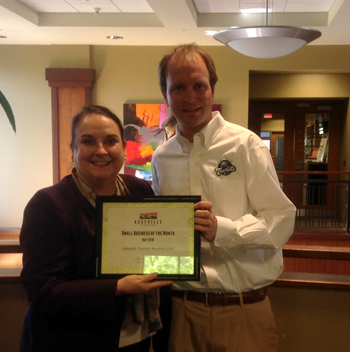 | Chamber Board Chair Suzanne DeFerie (Asheville Savings Bank) with Brian DeWine of the Asheville Tourists |
