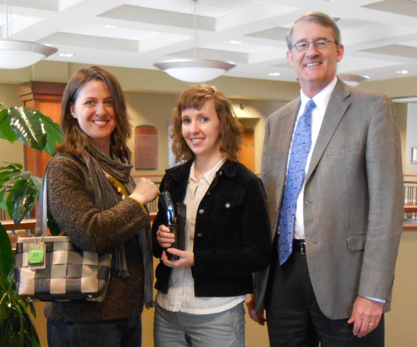| Foundry owners Shelly Piper and Natalie Hood show off a bag made from recycled materials (with Chamber Board member Dana Stonestreet). |