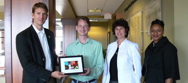 Christopher Johns (center) receives Small Business of the Month Award from Chamber Board Member John Miles with Chair Linda Brandt and Mayor Terry Bellamy |
