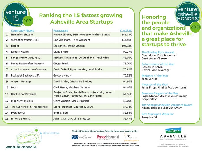 The Venture 15 and Venture Asheville Honors celebration is produced by Venture Asheville, the high growth startup initiative of the Economic Development Coalition of Asheville-Buncombe County (EDC) and the Asheville Area Chamber of Commerce.