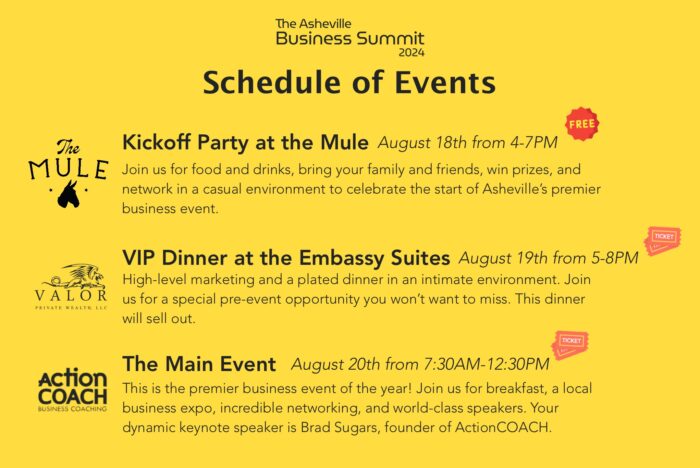 The Asheville Business Summit is being presented by ActionCOACH Business Growth Partners, where I am the Community Relations Manager. We strive to educate and inspire business owners and teams so that they are setting goals and creating systems that impact their businesses. The Asheville Business Summit is going to be amazing! Its a 3-day celebration of the WNC business community. Day one is free and open to the public – a kickoff party and networking event at The Mule on Sunday August 18th from 4-7pm. Day two is a VIP Dinner in downtown Asheville – a ticketed event intended for high-performing business owners, with entertainment and speakers. Day three is the Main Event! It is a ticketed event for people at all levels of business, whether you are a budding entrepreneur, sales team, or CEO of a large company. The Main Event will have a sponsor expo, breakfast, and world-class speakers at the brand new Embassy Suites. You’ll want to be in this room on August 20th from 7:30am until about noon.